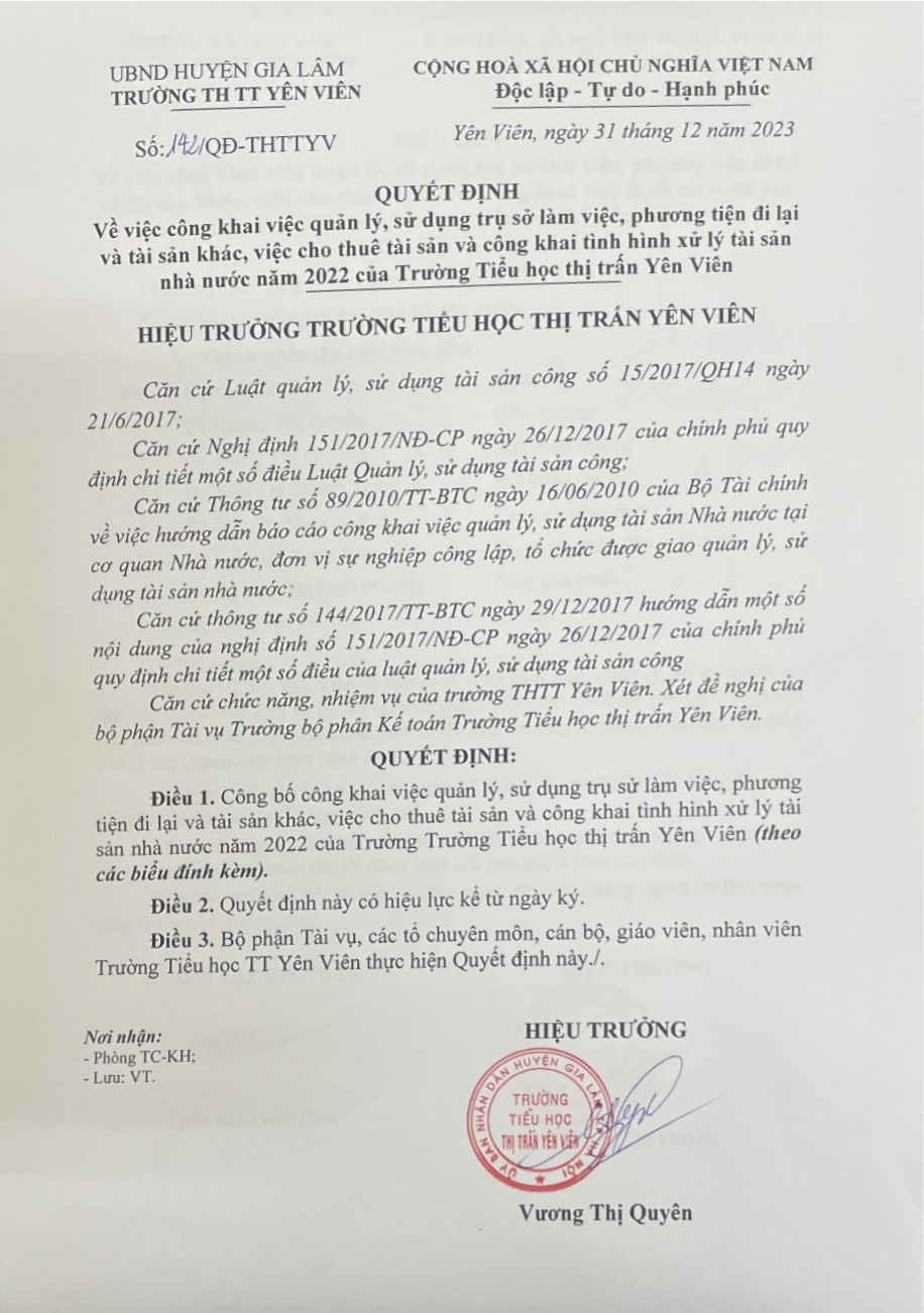 Ngày ban hành: 31/12/2023Số/Ký hiệu: 142/QĐ-THTTYV